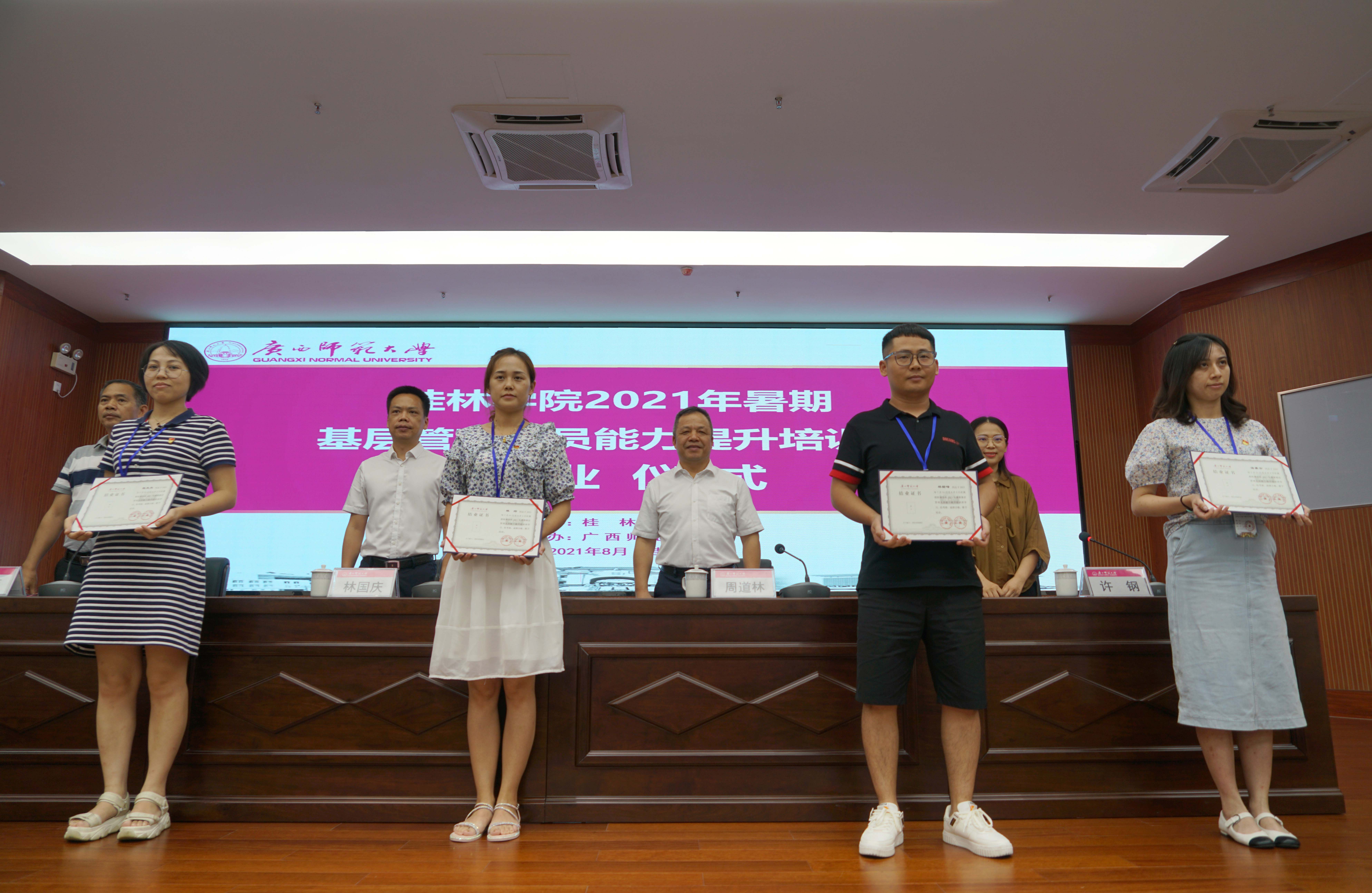 8月2日下午,桂林學(xué)院基層管理人員能力提升培訓(xùn)班結(jié)業(yè)儀式在廣西師范大學(xué)育才校區(qū)國(guó)際教育交流中心報(bào)告廳舉行,共有來(lái)自桂林學(xué)院的98名基層管理人員參加了這次為期三天的培訓(xùn)。廣西師范大學(xué)黨委常委、組織部部長(zhǎng)林國(guó)慶,桂林新城投資集團(tuán)黨總支書(shū)記、董事長(zhǎng)、總經(jīng)理、桂林學(xué)院董事長(zhǎng)周道林,桂林學(xué)院校長(zhǎng)楊樹(shù)喆等出席結(jié)業(yè)儀式。廣西師范大學(xué)干部教育培訓(xùn)學(xué)院辦公室主任許鋼主持結(jié)業(yè)儀式。