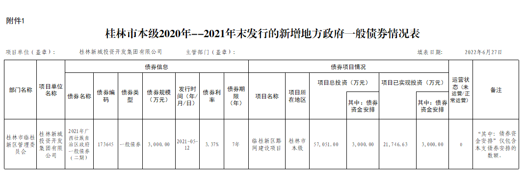 桂林新城投資開發(fā)集團有限公司關于2020年-2021年發(fā)行的新增政府債券使用和管理情況(一般債券)